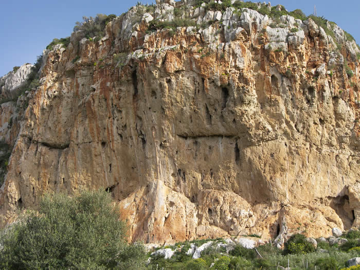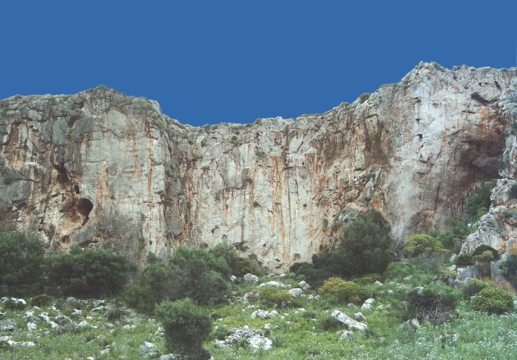Some lines on the cliff where previously climbed in the 80´s and old bolts, pitons and threads may be found, the route info was not published and the local climbers have decided these lines may be bolted. About a third of the way along the cliff from the north is a fenced-in cave with a few bolt routes, this has been excavated by archeologists and should be left unbolted, there is plenty more rock!
