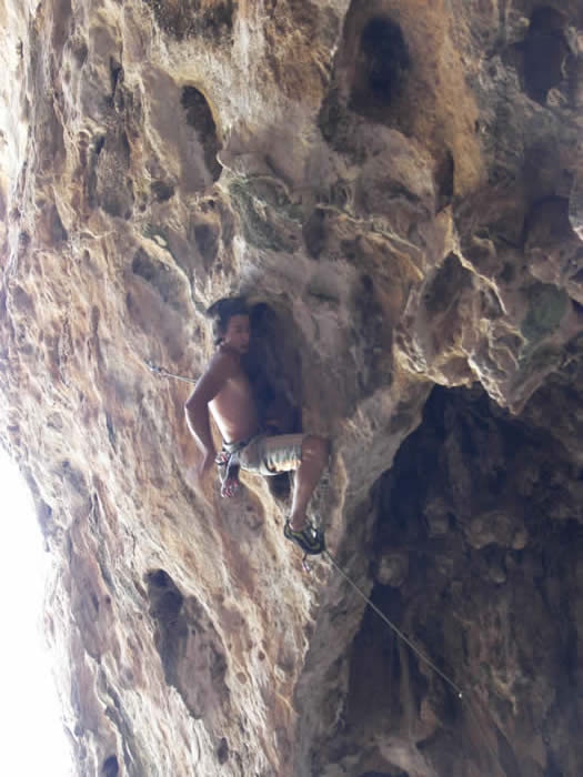 We have now bolted right up to the campsite fence so the first two topos are from there rightwards . This area, especially the big wall has some fantastic climbing on it and sometimes surprisingly amenable. Check out the picture below of Scott´s amazing Just for Fun in the big cave, just looking at it anyone would give it 7b but it really is 4c!