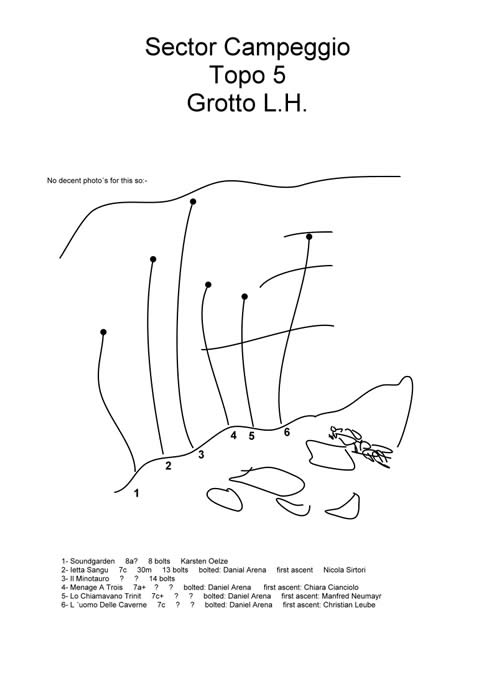 Naturally I had my drill with me and put up one new line at the Lost World but the amount of water in the rock (this was a week after the torrential floods in Sicily) stopped any further activity there. However an easier exit route up the obvious rightward sloping ramp to the left of the cave was bolted to give a reasonable way out. Scramble up to about half height and then climb out rightwards and up, ca 4+ and enough bolts for a competent climber. Bolt belay at the top. Rough topo in the new routes bit below.