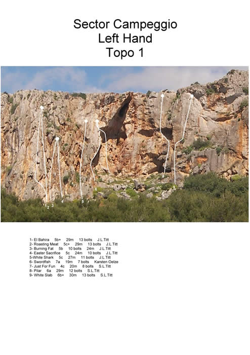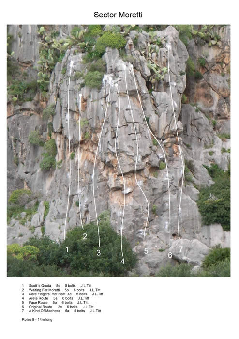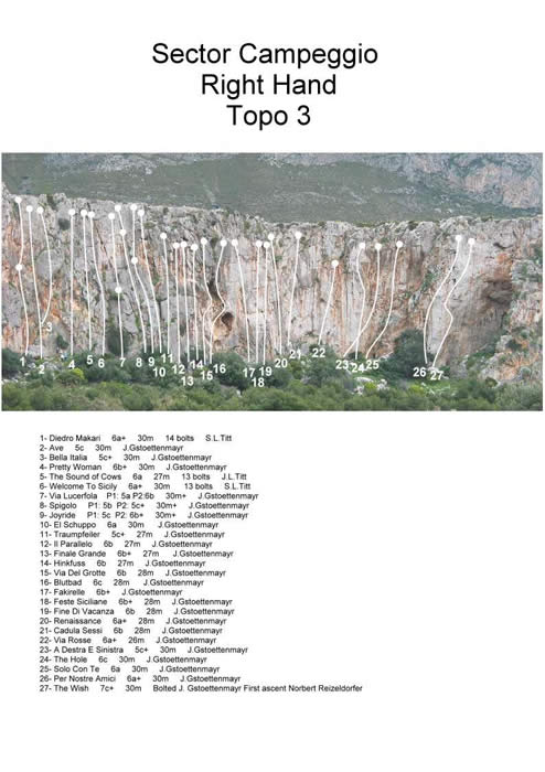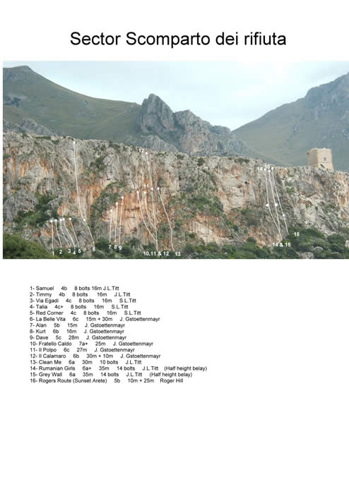 There are many more routes in the area, at the eastern end of the beach at San Vito is Monte Monaco with about 40 routes, mostly single pitch but with a number of longer routes up to 400m long, see the guidebook or website for details, another cliff nearby is Scopello with 13 sport routes and some good potential on the nearby sea cliffs. There are also a few trad routes from earlier days and I´ll try to get some translations of the descriptions though my information is that they are less than informative!