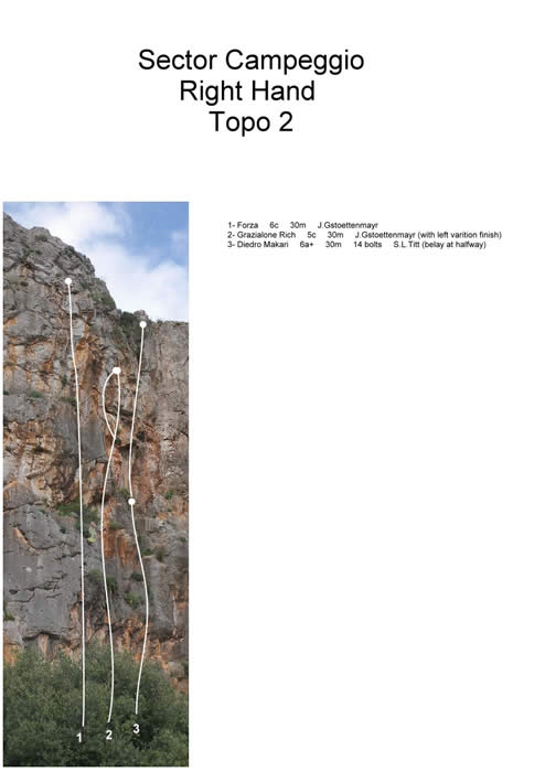 About 30m right of Sector Moretti is one harder route (7b+???) from K. Oelze on the right wall of a