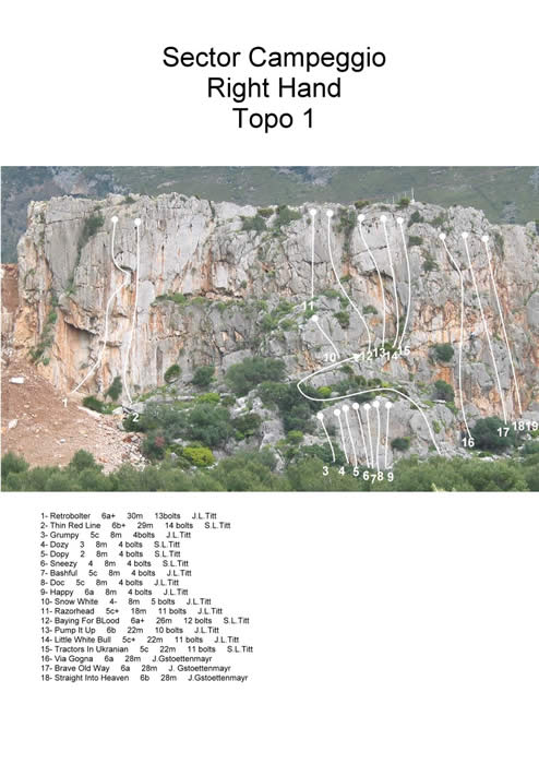 Again we visited San Vito and the cliff echoed with the chatter of drills, another 27 new routes being the result. I have added these to the old topo´s until I have time to re-do them all properly but as usual the names are painted at the start so you will find no difficulty.