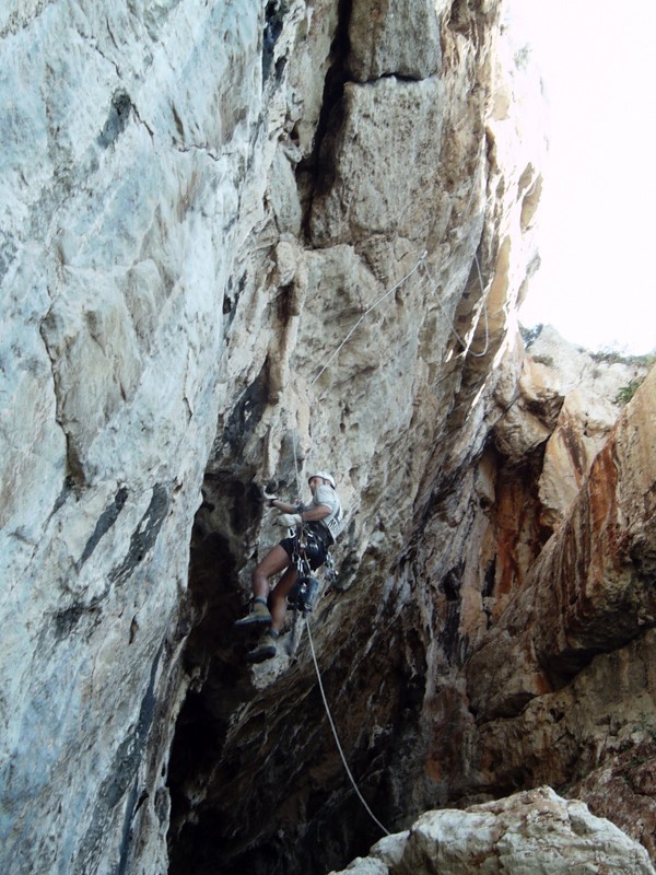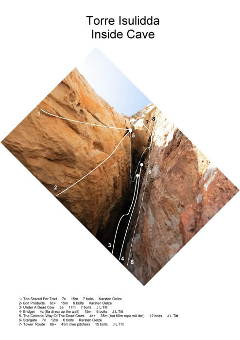 A summer holiday with my family in September 2007 (and drill of course) saw a few new routes put up, mainly under the Torre Isulidda and I started up a BIG new cliff near Custonacci (Never Sleeping Wall) but the beach and afternoon temperatures restricted my work, especially as most where ground-up solo´s. However I managed to bag a potential classic of the cliff ;- The Celestial Way Of The Dead Cow 4c+ in the cave under Torre Isulidda.