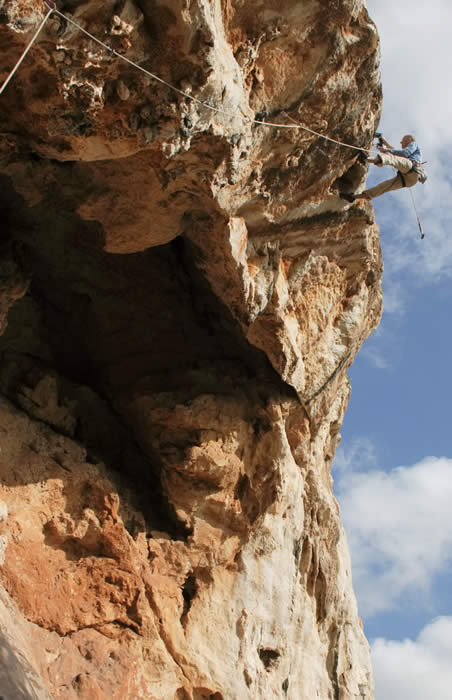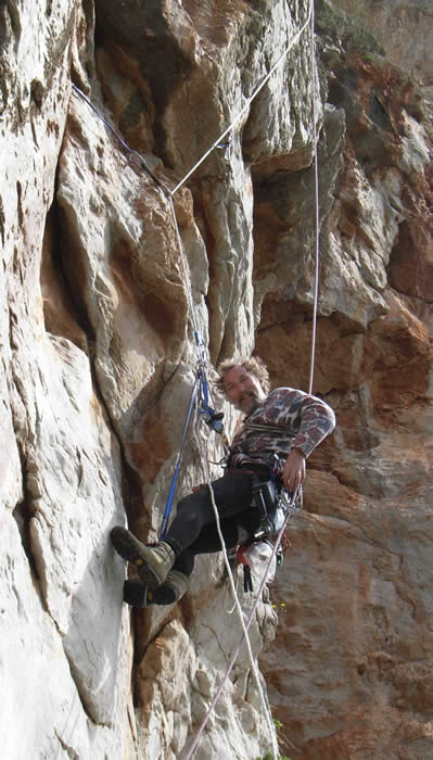 10 days in March with Karsten Oelze, Mel Holmes from England and myself saw some determined bolting in the face of some indifferent weather, a lot more gaps being filled with Karstens usual 7c to 8b stuff. Highlight was the expedition into sector Lost World, under the antennae mountain. Some truly massive tufa here which we have started bolting. Access is poor at the moment and climbing out over the left hand end turned out to be a harrowing experience- E12 comes to Sicily!