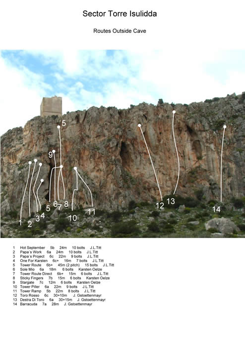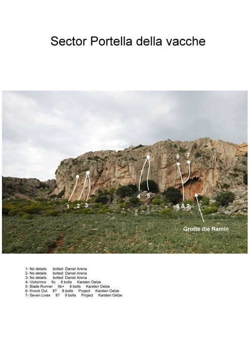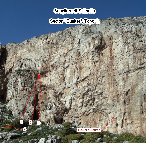 I still don´t have info for the routes at sector Bunker on the 60m overhanging wall right of the easy routes from myself but they are on the www.freeclimbingsicily.it website along with details of some other routes in the area . Additionally at this sector there is a cave further right with some more routes.