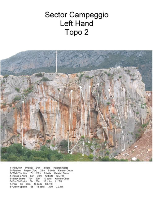I also drilled a line to the right of Green Spiders (No 26) in Salinella Camping, a great route:- Black Beetle, 6b+ 12 or so bolts. 30m.