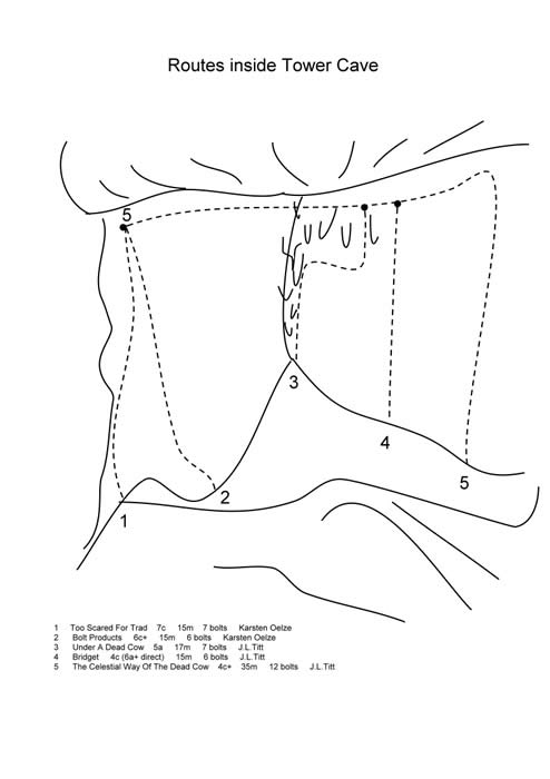 and to the right again a new route climbs the obvious cave- a top class 7a called Red Peroni bolted by myself and F.A. by Steve AdamsThere are some other hard routes around the pipeline at 7c and above, no info at the moment.